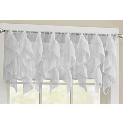 This option is for the valance only, one valance is included. Shabby chic style panel features polyester material and a Solid pattern with vertical ruffles Each panel contains spiraling cascades of material for an elegant effect and has a rod pocket header which fits most standard size rods: up to 1.5 inch diameter 24 inch Tier Pair measures 24 inches H x 28 inches W each (combined width 56 inches), 36 inch Tier Pair measures 36 inches H x 28 inches W EACH (combined width 56 inches), Valance measure 12 inches H x 56" W. Machine wash cold water, gentle cycle, no bleach, line dry.