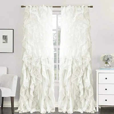 Rod pocket header simplifies installation Available in two sizes - 63Long x 50wide and 84Long x 50wide Shabby chic style panel features polyester material and a Solid pattern with vertical ruffles Each panel contains spiraling cascades of material for an elegant effect Machine wash for easy care