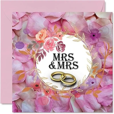 MAKE THEM SMILE WITH THIS ELEGANT WEDDING CARD: This exceptional quality wedding card for the happy couple shows a classy floral design with wedding rings with the words "Mrs & Mrs". If you are looking for elegant, classy cards for the newlyweds then is card is perfect. WHAT DO YOU GET: The card is printed on one side and BLANK ON THE INSIDE to allow you to write your very own message. The unique fun design is printed on a specially sourced and environmentally responsible board. At 360 microns thick the natural white one-sided gloss board has a quality look and feel. Supplied with a coloured gummed envelope to complement the design and ready to be sealed and sent in the post. LGBT Wedding card. NO INK SMUDGES: There is nothing worse than writing inside a card to find that the shiny surface makes the ink smudge. This is why we use a high quality one sided coated board. The uncoated side will absorb more of the ink from your pen to make smudging a thing of the past. SIZES: Greeting Card = 145mm x 145mm, Envelope = 155mm x 155mm, Card Thickness = 360 micron. MADE AND QUALITY CHECKED IN THE UK: We print and manufacture all our product right her in the UK so you can be sure of a fast turnaround and a product that is expertly made. Using environmentally responsible premium board our card is conscious of the responsible management of the world's forests.