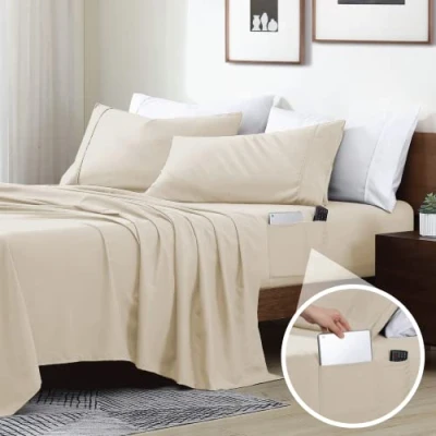 Swift Home Smart Sheets Brushed Microfiber 4 Piece Bedding Set, Luxurious, Soft & Durable, Deep Pockets, Sheet Pillowcase Fitted Bed with Side Storage Pockets Queen, Cream