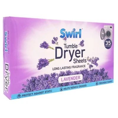Add the long-lasting fragrance of lavender to your laundry with the Swirl Tumble Dryer Sheets. Each pack includes 35 big sheets, suitable for fitting most tumble dryers.. These fabric conditioner sheets are specially designed for your tumble dryer. They help freshen and protect your clothes, towels and bedding from creasing and static cling.. Swirl Tumble Dryer Sheets Lavender. 35 big sheets. Protect against static. Helps reduce creases. Freshens fabric