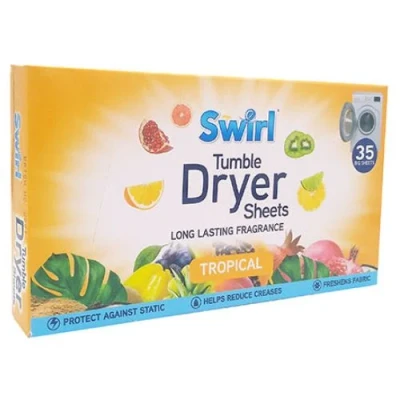 Add a refreshing, tropical fragrance to your laundry with the Swirl Tumble Dryer Sheets. An essential for doing your laundry, each bag includes 35 big sheets.. These fabric conditioner sheets are specially designed for your tumble dryer. They help freshen and protect your clothes, towels and bedding from creasing and static cling.. Swirl Tumble Dryer Sheets Tropical. 35 big sheets. Protect against static. Helps reduce creases. Freshens fabric