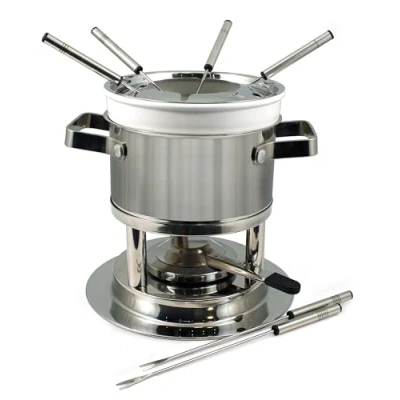 Stainless steel pot for meat fondue 1.6L Ceramic insert for cheese and chocolate fondues 0.8L Stainless steel patter guard for meat fondues 6 Numbered stainless steel forks Meat fondue - Simply remove the white ceramic bowl, put the splatter guard in place and you're ready for a meat fondue! Cheese and Chocolate Fondue - For cheese and chocolate fondue add water in the fondue pot, put in the white ceramic bowl in place and you are ready to go!