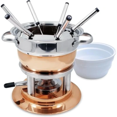 Made of copper-plated stainless steel This multi-purpose fondue has a ceramic insert that acts as a double boiler, so you can use one fondue for 3 different types of fondue - meat, cheese, and chocolate Meat fondue - Simply remove the white ceramic bowl, put the splatter-guard in place and you're ready for a meat fondue! For cheese and chocolate fondue add water in the fondue pot, put in the white ceramic bowl in place and you are ready to go! Set includes: 1 x stainless steel and copper pot 18L, 1 x ceramic insert for cheese and chocolate fondues 125L, 1 x splatter guard for meat fondues, 6 x numbered stainless steel forks Fire Gel sold separately