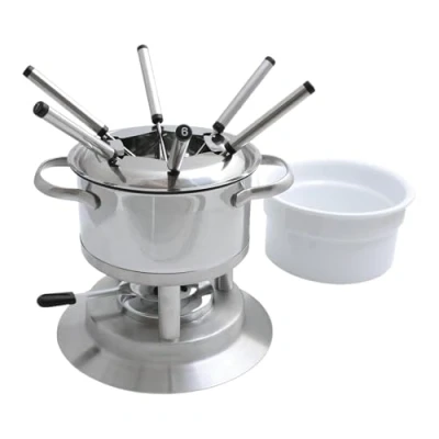Made of 18/8 stainless steel, shiny finish This multi-purpose fondue has a ceramic insert that acts as a double boiler, so you can use one fondue for 3 different types of fondue - meat, cheese, and chocolate Meat fondue - Simply remove the white ceramic bowl, put the splatter-guard in place and you're ready for a meat fondue! For cheese and chocolate fondue add water in the fondue pot, put in the white ceramic bowl in place and you are ready to go! Set includes: 1 x stainless steel pot 15L, 1 x ceramic insert for cheese and chocolate fondues 1L, 1 x splatter guard for meat fondues, 6 x numbered stainless steel forks Fire Gel sold separately