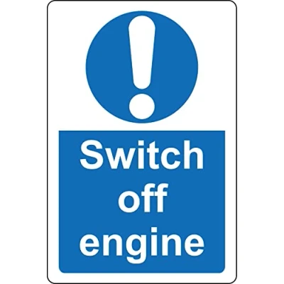 Switch off engine Safety sign Self adhesive sticker Digitally printed and laminated for extra durability Remove backing film and apply to dry, smooth, oil free surface.