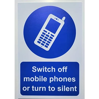 Switch off mobile phones or turn to silent Sign 1mm Plastic sign Digitally printed for extra durability Drill and screw in position or use double sided tape to mount onto suitable surface.