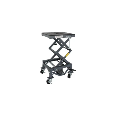ManoManoGeneral description SwitZer Hydraulic Motorbike Scissor Lift is designed specifically for lifting motorcycles during repairs. It features a safety bar to prevent accidental falls and a front wheel clamp to help position and secure the motorcycle. The adjustable foot enhances stability during use. Technical specifications Capacity: 300 lb (136 kg) Min height: 350 mm (13.8 inch) Max height: 870 mm (34.3 inch) Table size: 41 x 35 cm Gross weight: 30 kg Net weight: 28 kg Package size: 49 x 44 x 38 cm
