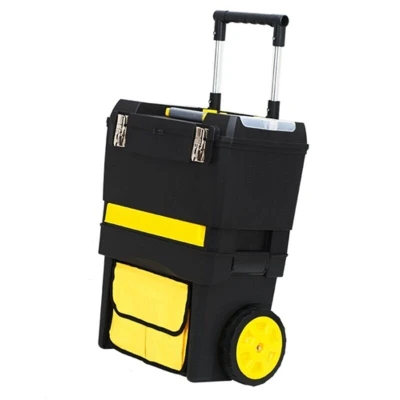 ManoMano" Product Features: * Modular stackable design with secure clip-lock latches keeps the upper toolbox firmly fixed to the rolling base for stable combined use or easy separation. The top section features two small transparent side lids for quick-access parts storage, making it easy to see and organize screws and accessories at a glance. * Built-in wheels and a sturdy pull handle make transport effortless, ideal for moving tools around job sites, garages, or workshops without heavy lifting. * The upper toolbox features strong metal latches and internal compartments, while a rotating parts tray underneath provides quick access to small items such as screws, fittings, or connectors. * Made from tough, impact-resistant plastic designed for everyday work environments, with reinforced structure to protect tools during transport and storage. * The lower section offers additional enclosed storage, complemented by a practical front pocket for frequently used tools or accessories, keeping