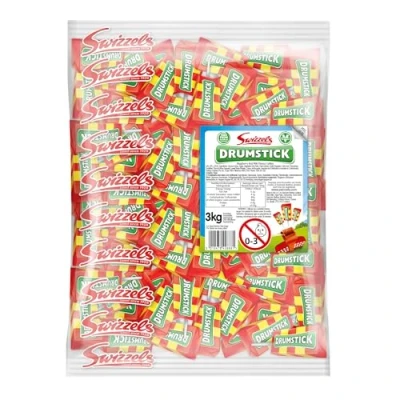 Raspberry and milk flavoured Drumstick Lollipop 1 x 3kg Bag No Artificial Colours Wrapped individual Drumstick Lollies Manufactured in the UK