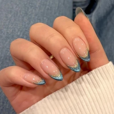 SXVME Glitter Cateye Blue French Tip Medium Almond, Soft Gel Press on Nails with 3D Gold Lines Design, Sparkle Acrylic Fake ons, Natural Nude Stick Nail for Women Daily Wear 24 Pcs