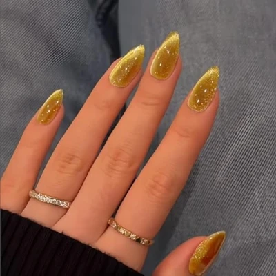 SXVME Gold Cat Eye False Nails Almond, Glitter Chrome Press on Medium Sparkly Shine Long Stiletto Yellow Fake with Design for Women Finger Decoration 30 Pcs