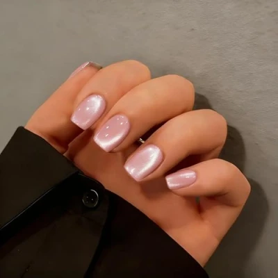 SXVME Nude Pink Cat Eye Press on Nails Short, 30 Pcs Summer False Square, Sparkly Glitter Fake Reusable Chrome Light Soft Gel Glue for Women Party Wear