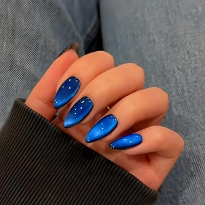SXVME Royal Blue Cat Eye Press on Nails Almond Shape, 30 Pcs Glitter False Medium Stiletto, Sparkly Bling Acrylic Fake ons, Shimmer Shiny Gel Stick Nail for Women Party Wear