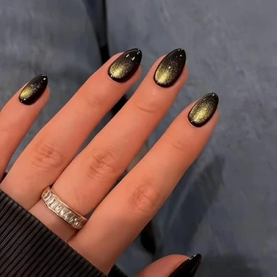 SXVME Soft Gel Press on Nails Short Oval, 30 Pcs Dark Gold Cat Eye False Almond, Sparkly Glitter Black Fake Set, Reusable Shiny Bling Stick Nail for Women Holiday Decoration