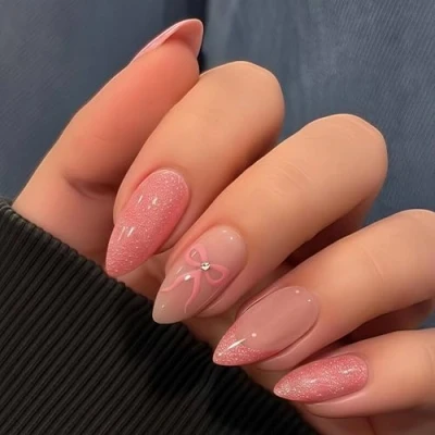 SXVME Valentines Press on Nails Medium Almond, Baby Pink Cat Eye French Tip False Cute Bow Crystals Pattern Full Cover Glitter Stiletto Fake Designed for Women Party, 24 Pcs