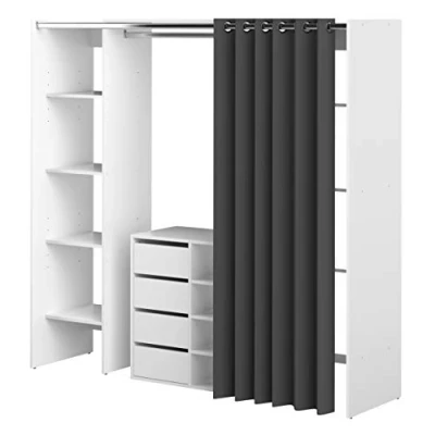 Walk-in wardrobe in oak and white, extendable from 112 to 185 cm. Space-saving product. 50 cm depth ideal for hangers. Two 40 cm side storage columns, each with two fixed shelves and two adjustable shelves. Its 100% quality cotton curtain in grey covers the entire dressing room well, even when open to its maximum. Functional and practical storage unit with its adjustable shelves and 4 drawers Supplied as a kit with assembly instructions (may not be in English) and reinforced packaging. Use: Indoor domestic. Maintenance: Easy to clean, cleans up with a cloth slightly dampened with water. Environmentally friendly. Guarantee: 2 years. Made in France.