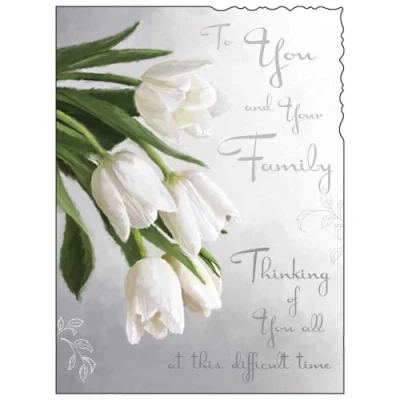 Sympathy Card To You and Your Family Special Finish White Tulips Design Illustrated Insert Leaf