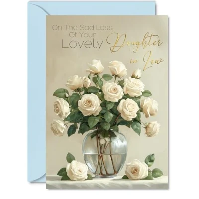 Convey heartfelt sympathy with our beautiful card, featuring a touching design of a bouquet of white roses and the heartfelt message, 'On the Sad Loss of Your Lovely Daughter in Law'. This premium-quality card features an elegant design with subtle gold accents, making it a meaningful keepsake for your loved one. Express your compassion and care through a personal gesture that provides comfort during a difficult time. Perfect for showing your deepest condolences and support. What's Inside: The sympathy card showcases a gentle monotone floral image, offering space for your personal message. Crafted on a 360-micron, eco-friendly board with a one-sided gloss finish, it has a refined look and feel. Paired with a colored gummed envelope to complement the design, it’s ready to be sealed and sent, making it a thoughtful and meaningful gesture of condolence. Ink Perfection: Say goodbye to ink smudges! Our high-quality one-sided coated board ensures a smooth writing experience without the worry of smudging. The uncoated side absorbs ink, providing a flawless finish that adds to the card's overall premium quality. Dimensions that Impress: Greet with grandeur using a card sized at 127mm x 178mm, accompanied by an envelope measuring 130mm x 180mm. The card boasts a thickness of 360 microns, ensuring a substantial and impressive presence. British Craftsmanship: Proudly crafted and quality-checked in the UK, our birthday cards are a testament to expert design and manufacturing. Utilizing Forest Stewardship Council certified board, we contribute to responsible forest management. Expect a swift turnaround and a product that reflects the highest standards of quality.