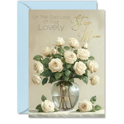Convey heartfelt sympathy with our beautiful card, featuring a touching design of a bouquet of white roses and the heartfelt message, 'On the Sad Loss of Your Lovely Step Mum'. This premium-quality card features an elegant design with subtle gold accents, making it a meaningful keepsake for your loved one. Express your compassion and care through a personal gesture that provides comfort during a difficult time. Perfect for showing your deepest condolences and support. What's Inside: The sympathy card showcases a gentle monotone floral image, offering space for your personal message. Crafted on a 360-micron, eco-friendly board with a one-sided gloss finish, it has a refined look and feel. Paired with a colored gummed envelope to complement the design, it’s ready to be sealed and sent, making it a thoughtful and meaningful gesture of condolence. Ink Perfection: Say goodbye to ink smudges! Our high-quality one-sided coated board ensures a smooth writing experience without the worry of smudging. The uncoated side absorbs ink, providing a flawless finish that adds to the card's overall premium quality. Dimensions that Impress: Greet with grandeur using a card sized at 127mm x 178mm, accompanied by an envelope measuring 130mm x 180mm. The card boasts a thickness of 360 microns, ensuring a substantial and impressive presence. British Craftsmanship: Proudly crafted and quality-checked in the UK, our birthday cards are a testament to expert design and manufacturing. Utilizing Forest Stewardship Council certified board, we contribute to responsible forest management. Expect a swift turnaround and a product that reflects the highest standards of quality.