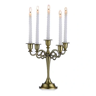 PACKAGE INCLUDES: 1 Pieces 5-arm candle holder. Candles are not included. They are bronze color with a brushed metal design, vintage & modern feel. ABOUT SIZE: The Base is 11cm/4.3 inches wide, 27cm/10.6 inches Height. Perfectly fit for all standard candlestick or taper candles. QUALITY DETAILS: Holders include velvet bases to protect your furniture and plastic ring inserts to keep your candles snug and secure. The wider base to prevent tipping over. THOUGHTFUL DESIGN: These candlestick holders are chic, modern and with a bit of Mid-century vintage. They also have a great weight which means they won't fall over from the weight of a candle or the wind. APPLICATION: Ideal for tabletop and mantle displays, centerpieces, wedding and home decor. Uage for Fancy dinner parties, holiday dinners, weddings and vintage bridal shower.