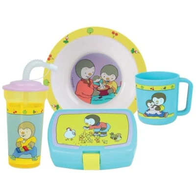 T'Choupi Children's Crockery Set with 1 Deep Plate Diameter 16 cm, Mug 350 ml, Straw Cup 400 ml and Snack Box Reusable Tableware