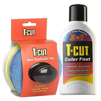 T-Cut CMW001 Colour Fast White 3 in 1 Polish Wax Clean & Restore 500ml Bundle with T-Cut Wax Applicator Set with Handle (2 Items) The T-Cut Colour Fast range is the easy way to clean, restore and wax your car! T-Cut Color Fast is ideal for most paint finishes, the advanced polymers, pigmented resins, and wax technology provide the easiest way yet to remove surface oxidation, blemishes and minor scratches leaving a deep gloss shine that lasts and lasts. T-Cut Color Fast restores without effort the shine and luster to all paintwork, including metallics. T-Cut Wax Applicator Set with Handle - Super soft microfiber and foam pad evenly applies waxes, polishes, sealants, creams, and glazes