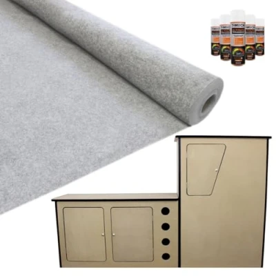 ManoManoKit out your van with this premium van lining carpet, available in a range of colours! The super stretchy yet durable design allows it to mould around wheel arches, windows and metal work easily with no creasing to get the perfect professional finish. The heavy duty carpet is 100% bleachable and is ideal for lining out vans, motor homes, cars and much more! Once you’ve finished lining your motorhome, finish the look off with this stylish yet sturdy camper kitchen! Really make it unique by sanding, painting, wrapping or spraying your new cabinets! 5 FREE cans of T-Mech ultimate trim adhesive included, which has an amazing high temperature resistance of 120° and a robust adjustable flow rate nozzle. Application is quick and easy with the specially formulated trim adhesive perfectly designed for use in the automotive industry. Lining Features: T-Mech high quality van lining carpet in silver grey. 5 FREE T-Mech ultimate adhesive cans included. The super stretchy design shapes with no