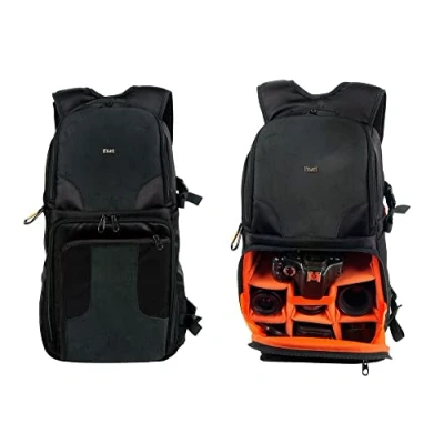 Backpack photo with shape-retaining foam Backpack with reinforced padding to transport and protect your SLR camera/camcorder and accessories. Main compartment with adjustable walls for camera and its accessories. Extendable impermeable case. Snap hook against theft Backpack
