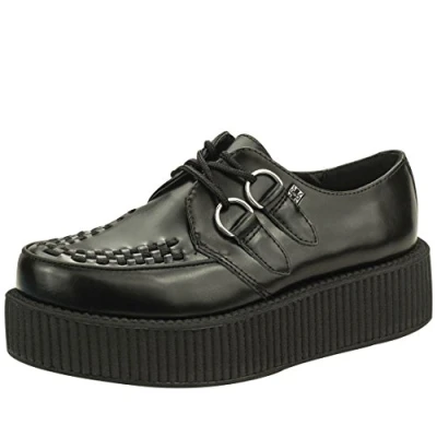 Our T.U.K. Round Toe Mondo Viva High Creepers feature our new lightweight & more flexible VIVA Creeper sole. These creepers have a woven interlace, and a metal D-rings. PREMIUM FEEL WITH PREMIUM MATERIALS: Using quality leather or suede this Viva High Creepers are in high-quality whilst incorporating a sturdy platform sole. Viva High Creeper shoes are built to withstand regular wear and tear, ensuring long-lasting use. COMFORTABLE FIT: These shoes have a cushioned insole that provides all-day comfort, while the outter sole offers additional support and shock absorption. VERSATILE STYLE: Whether you're going for a punk-inspired style or just looking for some goth shoes or emo shoes, these Creepers Sneakers are a perfect choice to make a bold fashion statement. THE ORIGINAL CREEPER SHOE COMPANY: T.U.K. Shoes creates original footwear for men and women with styles born in England but raised in California, made for bands, music fanatics, individuals with eclectic tastes, teddy boy shoes, rocker, punks and pin-ups. T.U.K. Shoes makes a huge range from traditional classics to modern upstarts, constantly providing creative style with a gritty edge.