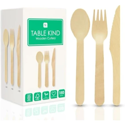 Table Kind 150 x Bulk Set Wooden Cutlery Biodegradable Knives, Forks, Spoons, 17cm Utensils, Perfect for Birthday Party, Camping, Picnics, BBQs, Christmas, Catering, Home Compostable Made in EU