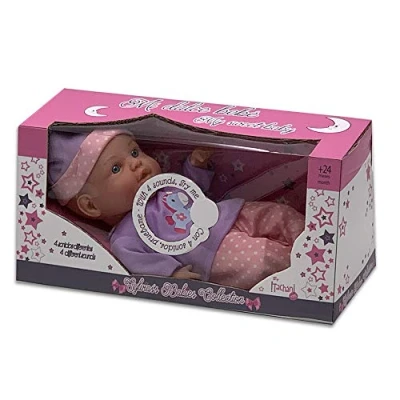 31 cm soft body doll with t-shirt and trousers in lilac colours It is a very soft and squishy doll, perfect as a first interactive doll; emits 4 different baby sounds that make the game become more realistic, can empathize and learn to care for others Its size is ideal from the age of 3, as it has a soft body facilitates its grip and has the right weight for the little ones Interact with this doll, create a game in which baby care is part of learning, make children stimulate empathy and their knowledge Requires batteries included, Manufacturer: CPA TOY GROUP TRADING S.L.