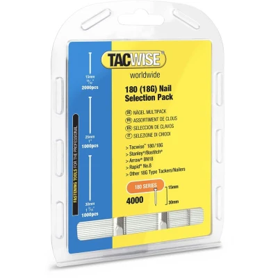 General description This product is a box containing 4,000 nails of type 180 L, available in lengths of 15 mm, 25 mm, and 30 mm. These 18G nails are designed for use with electric nailers and are ideal for DIY projects as well as professional applications. They are perfect for finishing tasks such as carpentry, joinery, door and skirting board framing, flooring, and light construction work. The nails can also be used to join soft to medium-hard woods. Technical specifications Quantity: 4,000 nails Type: 180 L Material: Steel Gauge: 18G Lengths: 15 mm, 25 mm, 30 mm Application: Suitable for electric nailers Compatibility and accessories Compatible with most major brands of stapling and nailing tools Installation Insert the nails into compatible electric nailers Adjust the depth setting as needed for your project Usage Ideal for carpentry, joinery, door and window framing, flooring, and light construction Suitable for joining soft to medium-hard woods Can be used for both DIY and