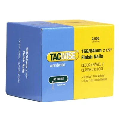 Premium quality, 16 gauge finish nails, thicker than 18G but thinner than 15G, providing a stronger hold for a range of professional nailing jobs whilst minimising wood splits Pack of 2500 x type 16G/64mm galvanised finish nails, designed for high volume nailing jobs with Tacwise, DeWalt, Senco, Bostitch and Paslode 16G nail guns Popular within woodworking (and second fix trades) due to their rust resistance, galvanised coating and smooth finish These versatile 16G nails have sufficient holding power for woodworking applications such as, interior trim, panelling, baseboards, crown moulding, stair risers, flooring, and light door and window casing Compatible with Tacwise FFN64LHH, GFN64V and other branded 16G finish nailers taking 16G/64mm nails (please always check compatibility with your tool before purchasing), Weight: 4.96 pounds, Manufacturer: Tacwise