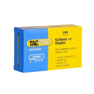 Premium quality, fine wire staples (thicker than type 13, but thinner than type 140) with sharp, V-shaped chisel points that provide easy penetration and a strong hold Pack of 5000 x type 53/6mm rust resistant galvanised staples, equivalent to Rapid 53, Stanley TRA200 and Arrow JT21 staples Popular for fixing paper, fabrics, cardboard, thin plastics, wraps, foam and fine mesh on a range of different materials Useful for indoor tasks such as DIY, general home repairs, art and craft projects, light upholstery and decoration jobs due to their discreet appearance Compatible with Tacwise Z1-53, Z1-53L, Z1-53T, Z3-53, Z3-53L, A19, Hobby 53EL, Hobby 53-13EL and 53-13EL, as well as Stanley, Rapid, Arrow and other tackers which take the 53 type staples (please always check compatibility with your tool before purchasing), Weight: 0.61949895622 Pounds, Manufacturer: Tacwise