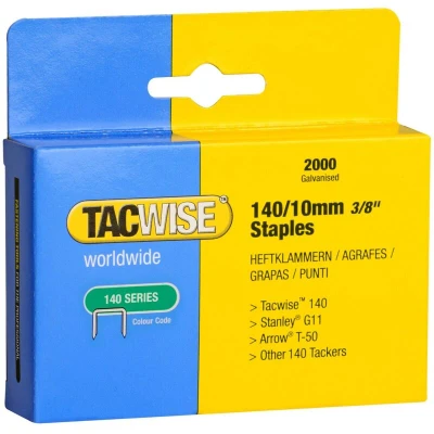 General description High-quality, heavy-duty galvanised staples designed for various stapling applications. Ideal for DIY, home improvement, and construction projects involving insulation, building membranes, and upholstery. Technical specifications Size: 10mm Pack quantity: 2000 staples Material: Galvanised steel for corrosion resistance Compatibility and accessories Compatible with Tacwise staple guns, electric staplers, and hammer tackers using 140 T50 G type staples Suitable for Tacwise A14014V and similar tools in the 140/10mm range Installation Insert the staples into compatible staple guns or tackers Use appropriate pressure and technique to ensure secure fastening Usage Ideal for attaching building membranes, insulation, and upholstery fabrics Suitable for both manual and electric stapling tools