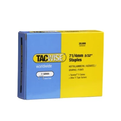 Premium quality, fine wire staples for large-scale upholstery projects, favoured for their discreet appearance and minimal surface damage Pack of 20,000 type 71/4mm galvanised staples, equivalent to Meite 71, BeA 71, Bostitch 72 and Senco C staples Popular for indoor upholstery tasks applications due to their rust-resistant, galvanised coating and strong holding capabilities Suitable for securing a variety of materials such as fabrics, pelmets, insulation, and linings, perfect for re-upholstery tasks Compatible with Tacwise A7116V, A7116LN, A7116P air staplers as well as any other staplers taking 71/4mm staples (please always check compatibility with your tool before purchasing), Manufacturer: Tacwise