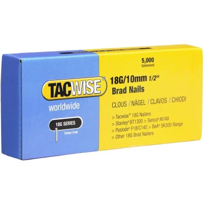Tacwise 18G Nails, compatible with Tacwise 18G nailers and other major branded in the market. Professional 18G Nail for Tacwise air nail guns, ideal for high volume nailing jobs Galvanised steel 18 gauge nails, conveniently packed in boxes of 5,000. Suitable for wood to wood & second fix applications. Perfect for second fix fixings such as door frames or skirting boards Also ideal for woodwork, sub-flooring, shop fitting, kitchen assembly and such like applications The Tacwise 18G Brad Nails are compatible with the follow makes and models. TACWISE 18G Nails Z3-13 15mm Z3-13L 15mm Z3-53 15mm Z3-140 15mm Z3-140 15mm 140EL (UK) 15mm Master NailerTM 181ELS (UK) 15-35mm Master NailerTM 181ELS (UK) 15-35mm Master NailerTM 181ELS (UK) 15-35mm Master NailerTM 191EL (UK) 15-35mm Master NailerTM 191EL 15-35mm Master NailerTM Duo 35 15-35mm Master NailerTM Duo 35 (EURO) 15-35mm Master NailerTM Duo 50 (UK) 20-50mm Master NailerTM 18G/50 20-50mm Master NailerTM 18G/50 20-50mm 53-13EL 4V 10mm
