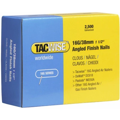 General description Tacwise 16G Angled Finish Nails are galvanised nails designed for use in 16G angled nail guns, nailers, and pinners. This pack contains 2500 nails, making it ideal for large projects or professional use. Technical specifications Gauge: 16G Length: 38mm Pack Quantity: 2500 nails Manufacturer Part Number (MPN): TAC0770 EAN: 5018505036474 Compatibility and accessories Compatible with DEWALT DC618, Paslode IM250A, and IM65A F16 Nailers Works with all other brand nailers that accept 16G angled nails Other information