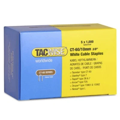 Premium quality, 'U' shaped thick steel staples useful for securing low voltage cables up to 6mm in diameter Pack of 5000 x type CT-60 / 10 mm galvanised staples, equivalent to Stanley 7, Rapid 36 and Arrow T25 staples Sharp divergent points for maximised holding power and rust-resistant, galvanised coating with a white finish for invisible tacking when used with white cable Popular for installing cables up to 6 mm in diameter like CAT 5e, CAT 6, RG59 coaxial cables for CCTV, video and internet and low voltage cables onto skirting boards, door frames, coving and many others Compatible with the Tacwise Z-CT Duo and Rapid, Arrow and many other cable tackers taking the CT-60/10 mm staples (please always check compatibility with your tool before making a purchase)