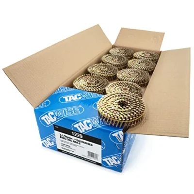Premium quality, flat top coil nails, providing exceptional hold under extreme loading pressures in heavy duty applications Pack of 14,400 x 25mm flat top coil nails with a 2.1mm shank diameter, 16° incline and wire collated in 360 nails per coil Galvanised, long-lasting, rust resistant nails with a diamond point for easy penetration and ring shank for increased holding strength Suitable for high volume nailing in cladding, pallet building, timber frames, siding, roofing, fencing, flooring, decking and many other construction work applications Compatible with Tacwise GCN57P, FCN55V and FCN57V coil nailers, also compatible with Bostitch, Makita and other coil nailers taking 2.1/25mm flat top coil nails (please always check compatibility with your tool before making a purchase), Weight: 22.3328271406 Pounds, Manufacturer: TACWISE