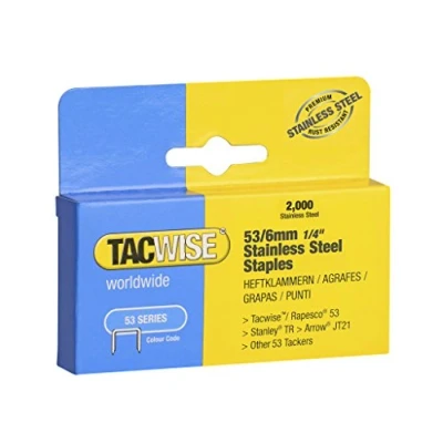 Premium quality, fine wire staples (thicker than type 13, but thinner than type 140) with sharp, V-shaped chisel points that provide easy penetration and a strong hold Pack of 2000 x type 53/6mm stainless steel staples, equivalent to Rapid 53, Stanley TRA200 and Arrow JT21 staples Popular for fixing paper, fabrics, cardboard, thin plastics, wraps, foam and fine mesh on a range of different materials Useful for indoor and outdoor tasks such as DIY, general home repairs, art and craft projects, light upholstery and decoration jobs due to their discreet appearance and stainless steel finish, providing 50 years protection against corrosion Compatible with Tacwise Z1-53, Z1-53L, Z1-53T, Z3-53, Z3-13L, A19, Hobby 53EL, Hobby 53-13EL, 53-13EL and Z2 Series, as well as Stanley, Rapid, Arrow and other tackers which take the 53 type staples (please always check compatibility with your tool before purchasing), Manufacturer: Tacwise