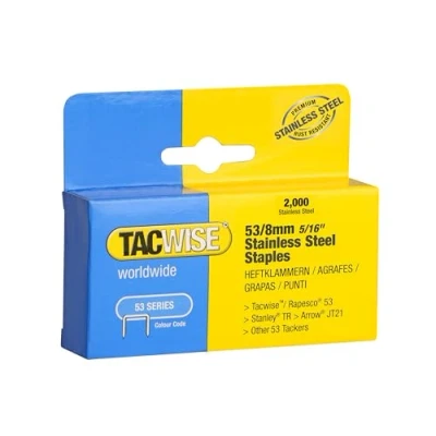 Premium quality, fine wire staples (thicker than type 13, but thinner than type 140) with sharp, V-shaped chisel points that provide easy penetration and a strong hold Pack of 2000 x type 53/8mm stainless steel staples, equivalent to Rapid 53, Stanley TRA200 and Arrow JT21 staples Popular for fixing paper, fabrics, cardboard, thin plastics, wraps, foam and fine mesh on a range of different materials Useful for indoor and outdoor tasks such as DIY, general home repairs, art and craft projects, light upholstery and decoration jobs due to their discreet appearance and stainless steel finish, providing 50 years protection against corrosion Compatible with Tacwise Z1-53, Z1-53L, Z1-53T, Z3-53, Z3-53L, Z3 4-in-1, A19, Hobby 53EL, Hobby 53-13EL, Z2 Series and Hobby 53 & 13EL tackers, also compatible with Stanley, Rapid, Arrow and other tackers which take the 53 type staples (please always check compatibility with your tool before purchasing), Weight: 0.22 pounds, Manufacturer: Tacwise