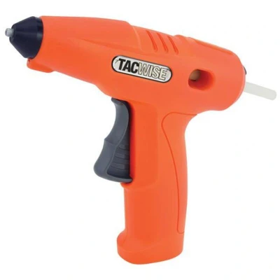 General description This cordless 4V hot melt glue gun is designed for DIY, arts and crafts, and home improvement projects. It offers quick heating, ease of use, and portability, making it suitable for various gluing tasks involving fabrics, wood, leather, cork, cardboard, and plastic. The gun is lightweight, impact-resistant, and features an ergonomic design for comfortable handling during extended use. Technical specifications Power supply: 4V lithium-ion rechargeable battery Battery charging time: approximately 1 to 1.5 hours Auto shut-off: after 5 minutes of non-use Glue stick diameter: 7mm Glue stick length: 150mm Output: approximately 2 grams per minute Weight: around 0.25kg Compatibility and accessories Compatible with Tacwise 7mm Type H hot melt glue sticks Supplied with: 30 x 7mm x 150mm hot melt glue sticks USB charging cable Neoprene storage bag Installation Insert a compatible glue stick into the gun's chamber. Charge the battery using the included USB cable until fully