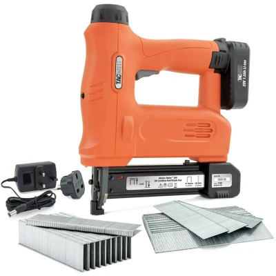 Tacwise 1701 Master Nailer 191 Cordless 20V Staple/Nail Gun with 1000 Staples and 2000 Nails SEMI-PROFESSIONAL 2-IN-1 STAPLE/NAIL GUN - Cordless, 20V staple and brad nail gun with a 20V battery supplied with 1000 x type 91 / 25mm staples and 2000 x type 18G / 32mm nails in a practical carry case; The high-capacity battery provides power for a more extended period . COMPATIBILITY - Offers a sequential (single shot) firing mode with a metal bottom-loading magazine that enables firing of 100 x type 91 / 15 – 25 mm staples or 100 x 18G / 15 – 32mm brad nails without reloading; We strongly recommend using Tacwise staples and nails for a smooth, uninterrupted performance. MAXIMISED PERFORMANCE - Powered by an interchangeable, rechargeable, quick-release 20V lithium-ion battery offering a 30 staple or nail per minute firing speed, around 1000 shots per charge, and a 1-hour charging time for maximised performance while stapling or nailing. 2.4KG ERGONOMIC DESIGN - Impact-resistant body and a
