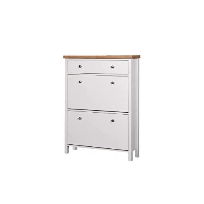 Transform your hallway or bedroom with the timeless elegance of the Astbury 3 Tier Shoe Cabinet. Combining classic British design with practical storage solutions, this cabinet is crafted to keep your footwear organised while enhancing your home’s décor. Key Features Elegant Design: Features a bright white frame complemented by a contrasting oak top for a sophisticated look. Ample Storage: Three spacious tiers provide plenty of room to neatly store your shoes and keep your space clutter-free. Durable Build: Constructed with quality materials and metal drawer runners for long-lasting use. Functional Details: Includes two pull-down drawers with round metal knobs for easy access and added style. Easy Assembly: Designed for simple self-assembly, making setup quick and hassle-free. Finish & Materials The cabinet boasts a crisp white finish with a contrasting oak top, evoking a classic solid wood appearance. Metal drawer runners and round metal knobs add durability and refined detailing.
