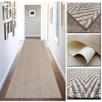DIGITAL VINYL CARPET Digitized chevron patterns, beige, brown, ochre tones... very realistic effect, with non-slip base, composition: 80% PVC and 20% polyester. Wide assortment of sizes in addition to all available dimensions, it is very easy to handle, you can attach it to your space without any problem, with a cutter or scissors. EASY CARE - Washable mats, you can keep them clean without moving from the place, vacuuming them with neutral soap and water. Various uses. Available as rugs for hallways, kitchen, living room, entryway, bathroom, bedroom or carpet. Natural effect and reserved for use, this design achieves the natural effect of jute or braided sisal, but thanks to its composition (digital vinyl and PVC), this rug makes it a very hygienic, easy to wash and hypoallergenic mat.