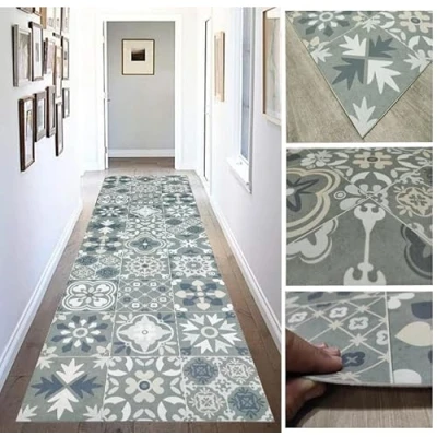 Digital vinyl carpet, silver, blue and ring tiles on a green background, hydraulic designs, each drawing (hydraulic) has a dimension of 20 cm x 20 cm, the texture imitates the tiles very realistic, its texture has small embossing that emphasises the realism. Composition: 80% PVC and 20% polyester. Protective textile backing Classification when using 33 teeth and fire resistance BFL/S1 with which you are qualified, it becomes a very durable carpet that is designed for long time use and very durable and both insulated and water resistant. The printed vinyl rugs adorn your floors, provide comfort, design and safety and hygiene. With a total thickness of 3 mm. Easy care: washable carpets keep them clean without moving from place by vacuuming them and cleaning them with neutral soapy water. Various sizes and shapes. Available as a rug for hallway, kitchen, living room, hallway, bathroom, bedroom or as a carpet. You can also cut and customise them at home with cutter or scissors. Suitable for high transport; as this product complies with regulations and is suitable for commercial use, nursery or school classrooms, offices, meeting rooms or hotels.
