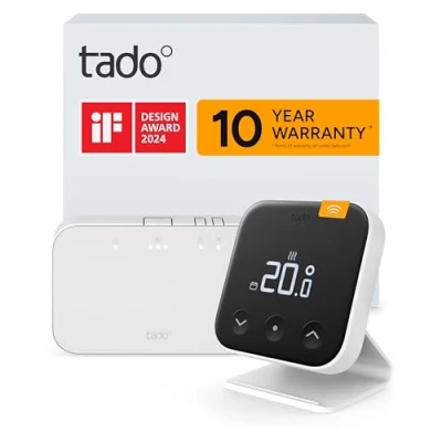 SAVES ENERGY AND HEATING COSTS: The intelligent wireless Thermostat X Starter Kit from tado, the experts for smart heating, contains the Bridge X and, for Amazon customers, a stand – the more rooms your control, the more you save EASY DIY INSTALLATION, EVEN OFFLINE: When connected to a boiler, this smart heater thermostat can regulate hot water – suitable for gas-fired boilers or heat pumps (OpenTherm and relay) CONTROL VIA APP: The thermostat has numerous features for your heating system, such as smart scheduling, temperature control via the app and much more FOR YOUR SMART HOME Control the individual temperature in each room with the industry’s leading multizone control, very simply by app or via smart speaker with Amazon Alexa, Google Assistant or Apple Siri EASY TO USE: The thermostat is operated intuitively via the display FUTURE-PROOF TECHNOLOGY: Matter allows different smart home appliances to communicate with each other, while Thread ensures a stable network – this requires the Bridge X (included) or another Thread border router MAXIMISE SAVINGS WITH AI: With ‘AI Assist’, you save up to 55% more energy thanks to automations such as Geofencing, Open Window Detection, Holiday Mode, insights into energy costs, and much more Important to know: tado X products are not compatible with tado V3+ or older, Weight: 1.3007273458 Pounds, Manufacturer: tado°