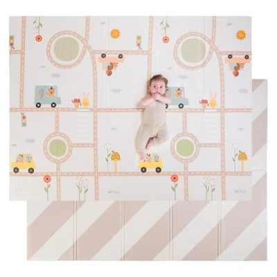 EXTRA LARGE PLAY MAT - This extra large baby play mat transforms any floor into a roomy, imaginative playground; encouraging active play, crawling, and family fun times. Its generous size makes it an ultimate baby floor play mat for stretching little ones' potential, fostering developmental milestones while offering plenty of space for interactive family bonding moments that create cherished memories and boost cognitive and motor skills in a safe environment. REVERSIBLE PLAYMAT - Dual-sided playmat combines creativity and elegance; one vibrant fantasy road scene for interactive play, inspiring imagination with each ride, and one chic pattern that seamlessly matches home decor. Transition effortlessly between stimulating playtime and sophisticated appearance, meeting every family's aesthetic needs with bold, engaging visuals on a foldable play mat perfect for both baby and parent's delight. WATERPROOF BABY MAT - Keep playtime mess-free with our waterproof play mat for babies. Spills and accidents wipe away with ease, allowing constant clean fun. Featured as both baby-friendly and parent-friendly, this durable, wipeable play mat saves you time and hassle, ensuring that spills never interrupt your little one's imaginative adventures or your minimalist aesthetic, making it the perfect practical companion for busy families. FOLDABLE FOR EASY STORAGE - This foldable baby mat for floor offers effortless storage solutions; with its easy-to-fold design, you can tuck it away neatly or bring it along for on-the-go adventures. Whether you're heading to a park or visiting family, its portability ensures your child's playtime carries on without interruption, retaining all the comfort and fun that this foam play mat provides, wherever you are. Nontoxic, BPA free, PHP free, Lead free, Phthalate free & Mercury free. COMFORT & SAFETY - Crafted for peace of mind, our kids play mat provides a plush, cushioned surface that cradles infants safely during tummy time and active play; protect their delicate skin with this baby-safe playmat that is free from harsh chemicals, reassuring parents while engaging babies in joyful exploration. Its ample cushioning acts as a barrier on hard floors, ensuring every bounce, giggle, and snuggle is wrapped in comfort and protection, nurturing blissful play.
